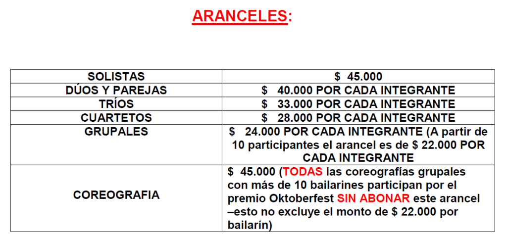 *Los aranceles arriba mencionados son POR CADA bailarín por CADA PARTICIPACIÓN salvo el arancel POR COREOGRAFÍA que es $ 45.000 el total (esto no excluye el monto de $ 24.000 por bailarín)