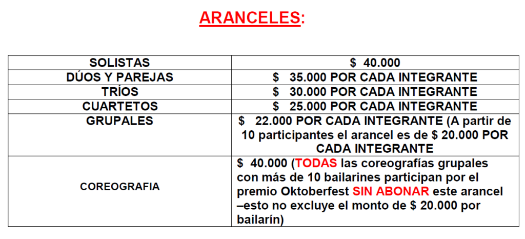 *Los aranceles arriba mencionados son POR CADA bailarín por CADA PARTICIPACIÓN salvo el arancel POR COREOGRAFÍA que es $ 40.000 el total (esto no excluye el monto de $ 22.000 por bailarín)