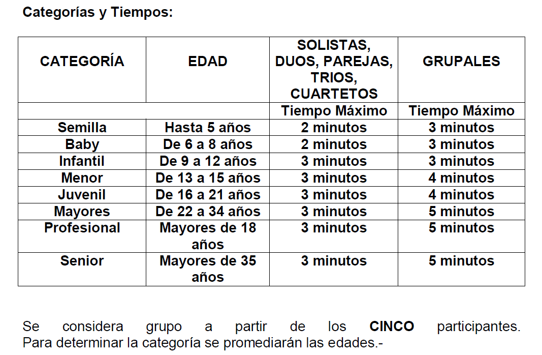 Para participar de este rubro deberá presentarse un mínimo de 5 coreografías inscriptas. (Podrán ser de cualquier modalidad -Arabe, Español, Jazz, etc- y forma –solo-dúo-trio, etc- pero únicamente participará de este premio la modalidad GRUPAL).